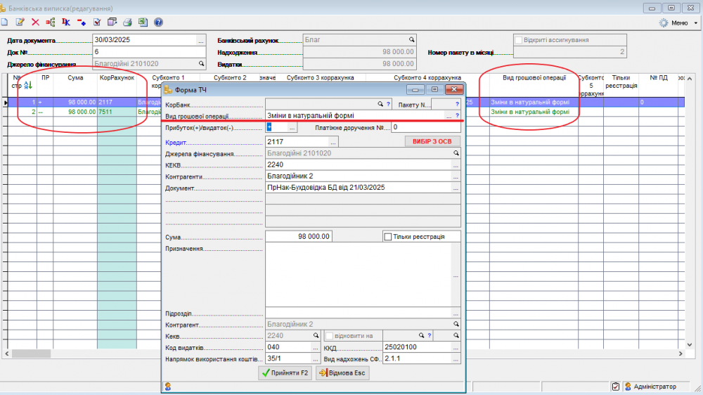 Якщо попередня довідка в натуральній формі пройшла з не вірними даними і з'являється необхідність зняти асигнування та видатки по ній, потрібно зробити довідку про зміни до кошторису і в банківській виписці в рядках які відповідають на зняття, проставити в графі “Вид грошової операції” ознаку “Зміни в натуральній формі”