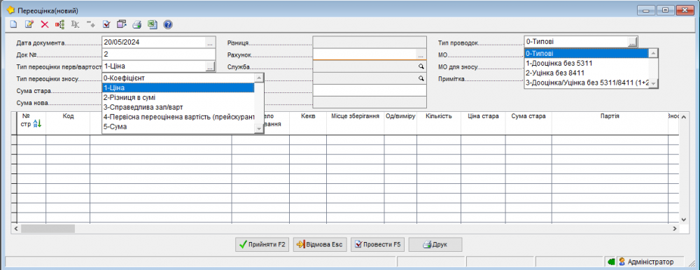 3-Дооцінка/Уцінка без 5311/8411(1+2) - використовуємо коли потрібно уточнити ціну активів, в цій операції не буде задіяна типова кореспонденція субрахунків, а мінусом (сторно) зніметься стара ціна, і плюсом подставиться на облік нова