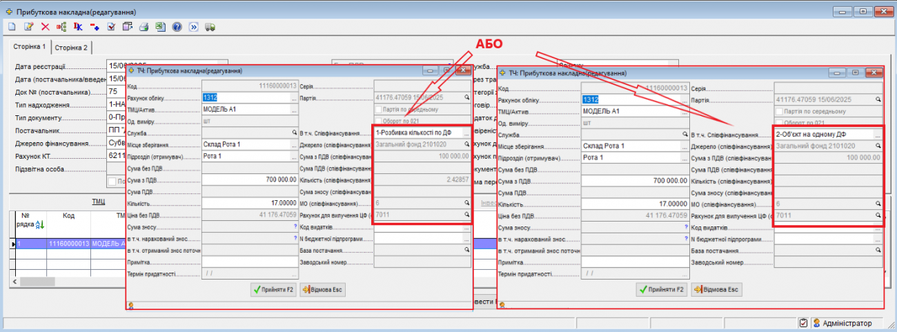 При виборі ознаки -2- майно буде обліковуватися на одному джерелі фінансування (яке зазначене в шапці прибуткової накладної) але будуть здійснені автоматичні проводки для відповідного відображення операцій в МО6 та МО2(3)