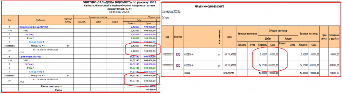 При виборі ознаки -1- майно буде розділено кількістю по джерелам, і в кількісно-сумовій книзі, і в оборотно-сальдовій відомості