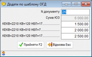 2)В діалозі заповніть Номер документу(по замовчанню він збільшується на 1) та сумми по статтям за необхідності.