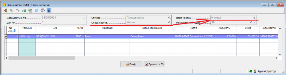 Після того, як заповните шапку документа добавляєте новий елемент, програма вам підкине всі ТМЦ по конкретній службі і на певну дату, які будуть змінені на нову назву.