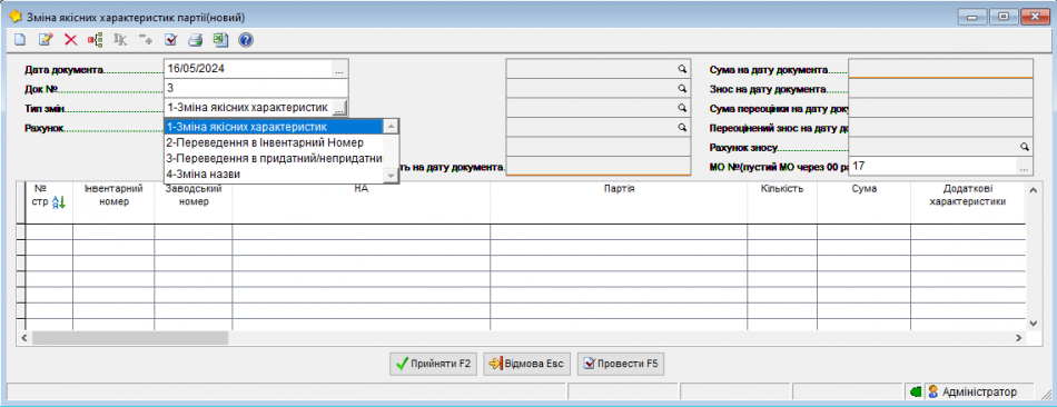 _Kind | N1 | Тип змін | 1 -Зміна якісних характеристик (породжує нові партії з новими характеристиками); 2 -Перевід в Інвентарний Номер (створює з номенклатурного номеру нові інвентарні номери) |