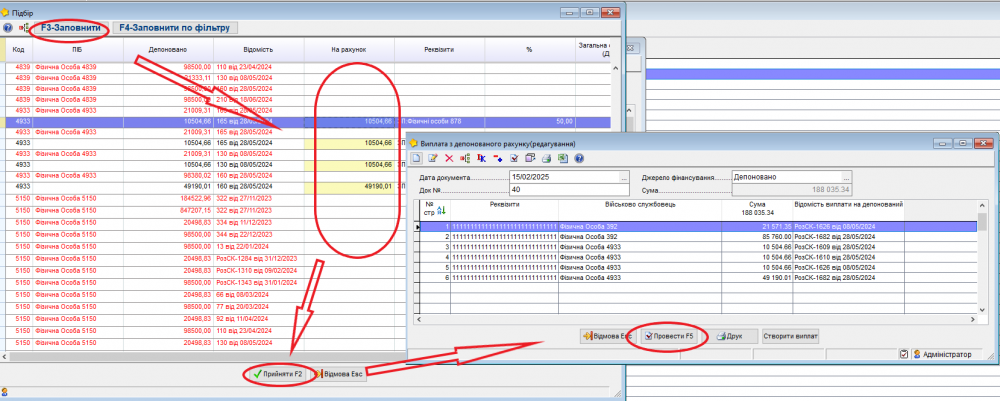 Для виплати з депонованого рахунку використовуєте “Сервіс” –> “Документи” –> “Виплата з депонованого рахунку” –> Додаєте новий елемент У новому документі заповнюємо шапку, де вказуємо дату сплати з депонованого рахунку і джерело, джерело фінансування тут обов'язково вказуєте “Депонований”. Далі “додати новий елемент”, формується підбір, де вказані всі депоновані суми по співробітникам. По тим людям, де вже відомі реквізити чи доданий інший отримувач буде виділена жовта клітинка, на яку стаєте і натискаєте “F3-Заповнити”, “F4-Заповнити по фільтру” проставить суми по всім відомим реквізитам.