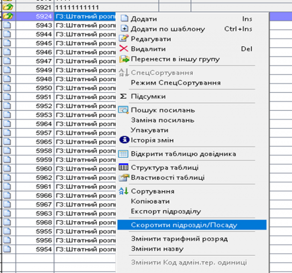 Для скорочення Підрозділу/Посади на потрібній позиції по правій клавіші миші обираємо пункт Скоротити Підрозділ/Посаду. Зазначаємо дату, з якої посада не діє. При скороченні підрозділу/посади є можливість одразу вивести людей у Розпорядження (із вибором посади Розпорядження) або без виведення і збереження останнього грошового забезпечення протягом двох місяців.