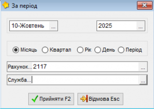 Вказти період за який були введені прибуткові накладні, на балансові рахунки, та рахунок дебітора/кредитора (2117/6211/6415) по якому сформовані прибуткові, служба вказується при необхідності, якщо потрібно довідку сформувати по конкретній службі, якщо поле “Слажба” буде пусте, довідка сформується загльна (по всім службам, по яким за вказаний період були сфорнмовані накладні, але по ним ще не було банківської виписки).