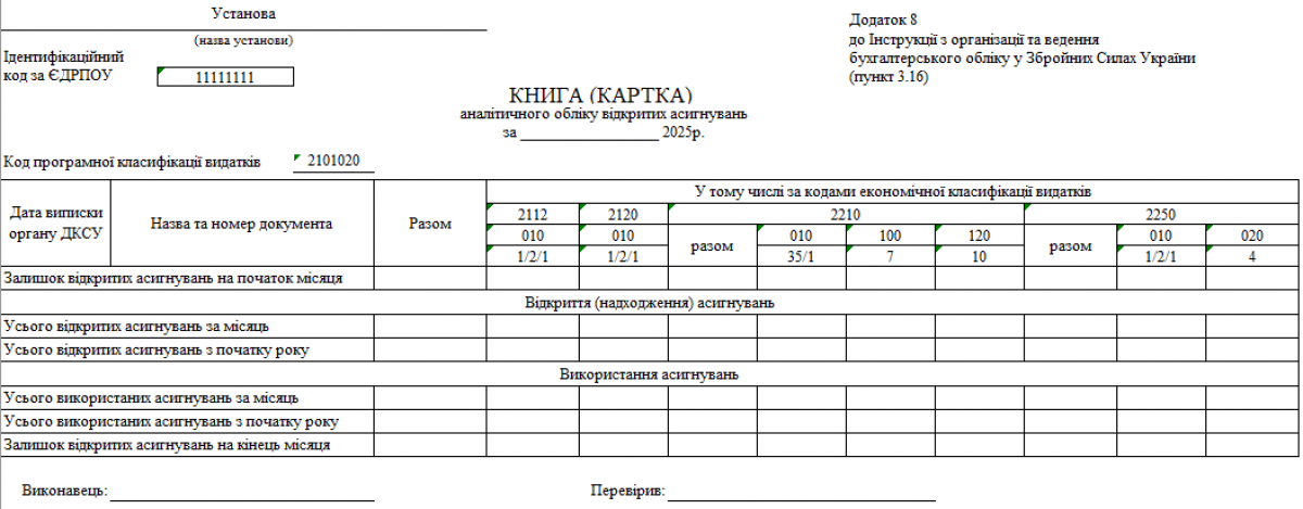 КНИГА (КАРТКА) аналітичного обліку відкритих асигнувань (Додаток 8)