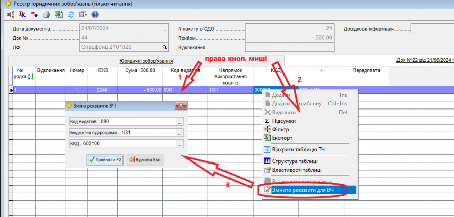 8. Внести зміни по юридичним зобов'язанням, які експортовані в СДО не потрібно відмовлятися від експорту, а в потрібних документах, де потрібно вказати певну інформацію на сірому фоні натисніть праву кнопку миші і у додатковому меню виберіть “Змінити реквізити для ВЧ”.