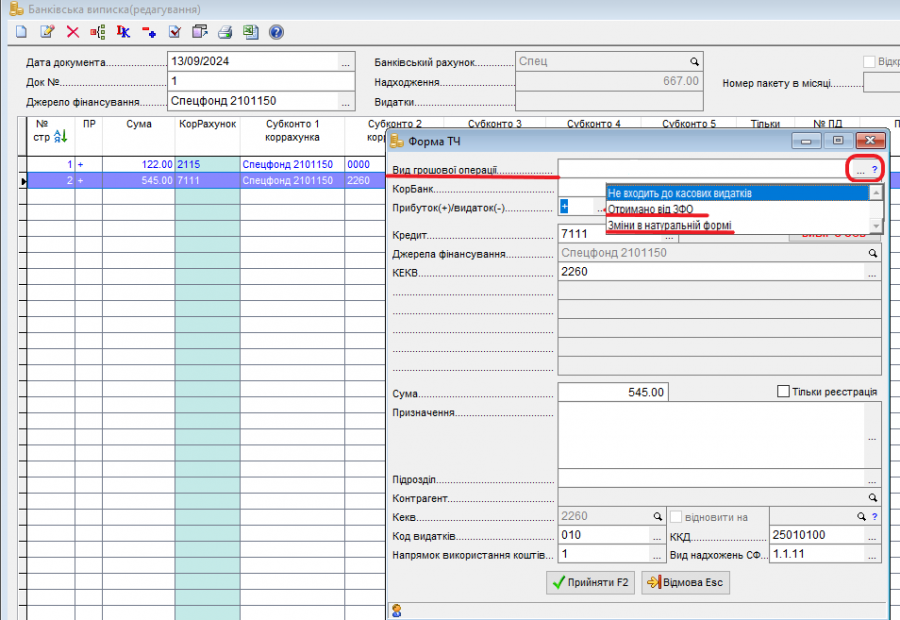 9. Якщо було фінансування по формі бюджетної звітності 4-1 та 4-2 від загального фінансового органу “ЗФО”, то таке фінансування потрібно відокремити у банківській виписці, тобто зайти в необхідну БВ та у графі “Вид грошової операції” зазначити: “Отримано від ЗФО”. При зміні довідки у натуральної форми (в попередній довідці не вірно вказали КЕКВ чи КПК, і зараз знімаєте з мінусом) то у банківській виписці в даній графі обираєте “Зміни в натуральній формі”.