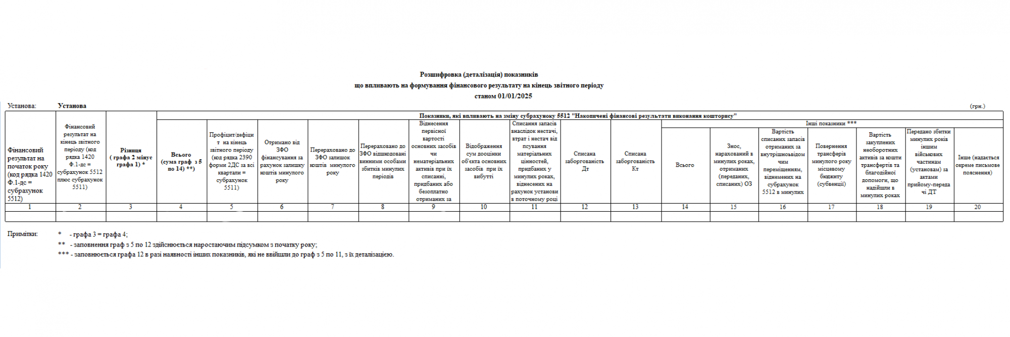 Колонка 1 - Фінансовий результат на початок року - сальдо рахунку 5512 на початок року, який дорівнює рядку 1420 формі 1-ДС фінансової звітності на початок звітного періоду.