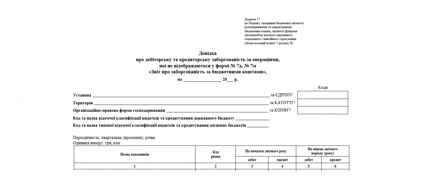 В даній довідці відображається інформація про заборгованість за виплатою допомоги і компенсацій громадянам, розрахунками за операціями з внутрівідомчої передачі запасів, розрахунки за депозитними операціями та інші заборгованості, які не взяті на облік органами Казначейства і не вважаються бюджетними.