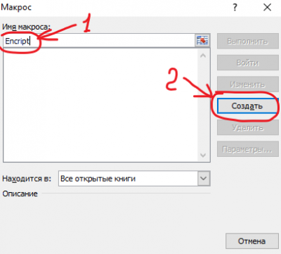 3.Введіть назву макроса (1) і натисніть кнопку «Создать» (2) Примітка: назва макроса має складатися з латинських літер – рекомендуємо Encrypt