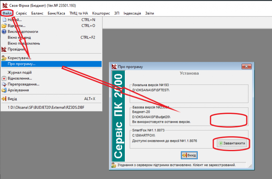 Меню Файл –> Про програму… –> у вікні, що з'явиться натиснути на першу кнопку Завантажити, коли пройде зелений бігунок натиснути іншу і т.д. Після того як завантажаться всі оновлення необхідно вийти всім користувачам з програми і одному користувачу (не обов'язково, щоб це був сервер) потрібно зайти в програму в монопольному режимі.